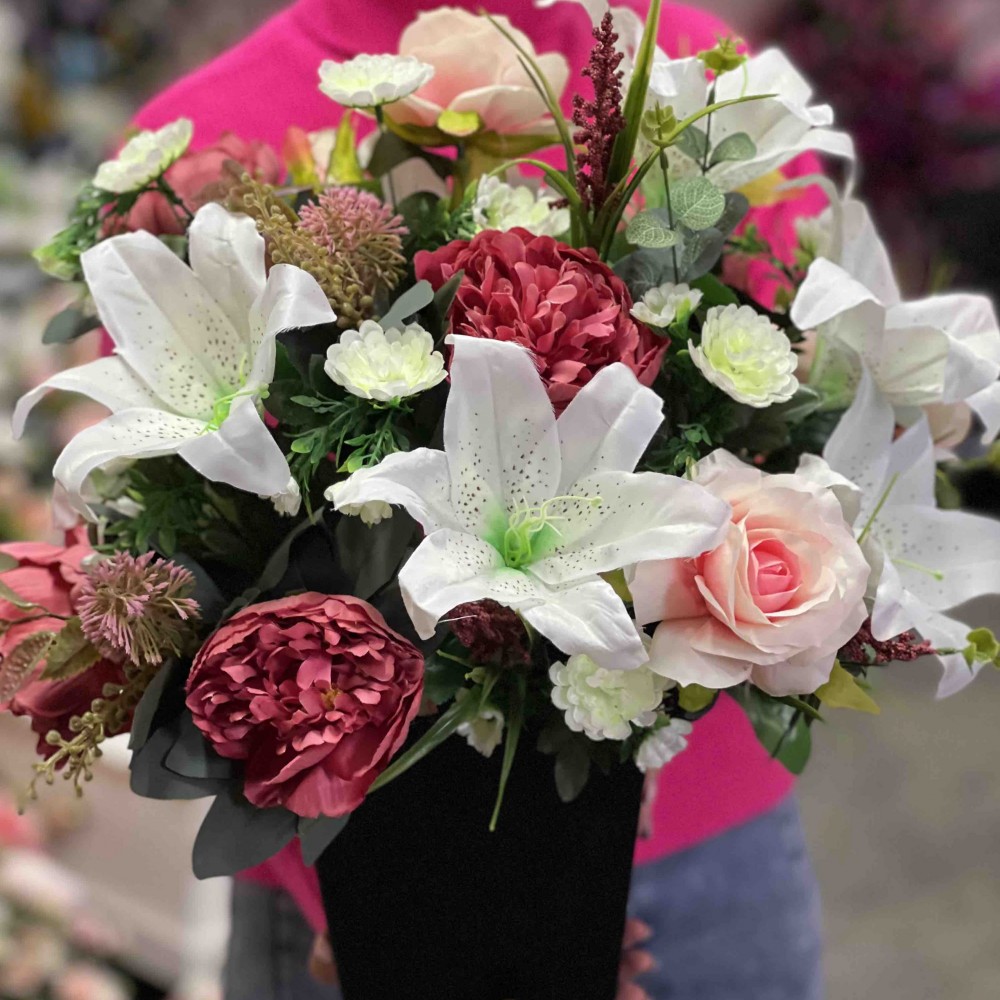 Искусственный материал премиум качества сохранит внешний вид цветочной композиции на долгое время.