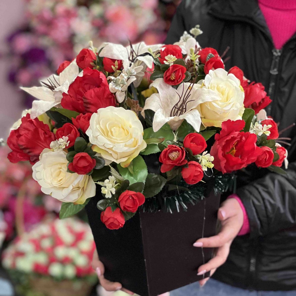 Искусственный материал премиум качества сохранит внешний вид цветочной композиции на долгое время.